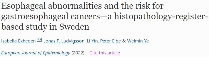 Ekheden, I., Ludvigsson, J.F., Yin, L. et al. Esophageal abnormalities and the risk for gastroesophageal cancers—a histopathology-register-based study in Sweden. Eur J Epidemiol (2022). https://doi.org/10.1007/s10654-021-00833-6