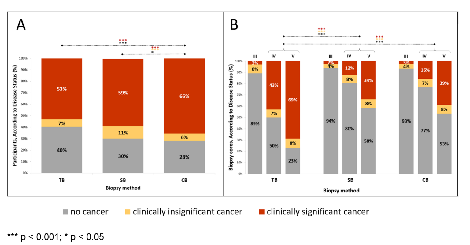結果發現,基于PI-RADS 3、4和5級的PCA,CB的CDR為24%、72%和98%,csPCA的CDR分別為17%、64%和96%。CB比TB檢測到更多的PCA和csPCA(P<0.001)。然而,在PI-RADS 4-5級患者中,TB對PCA和csPCA的檢出率更高(P<0.001)。活檢和前列腺切除術分級之間的一致性在CB中最高,其中有25%的男性誤診為csPCA。TB漏掉了10.2%的指引性病變癌癥,低估了7%的csPCA。在這些病例中,檢測到了76%的csPCA,其中85%由SB升級為csPCA。