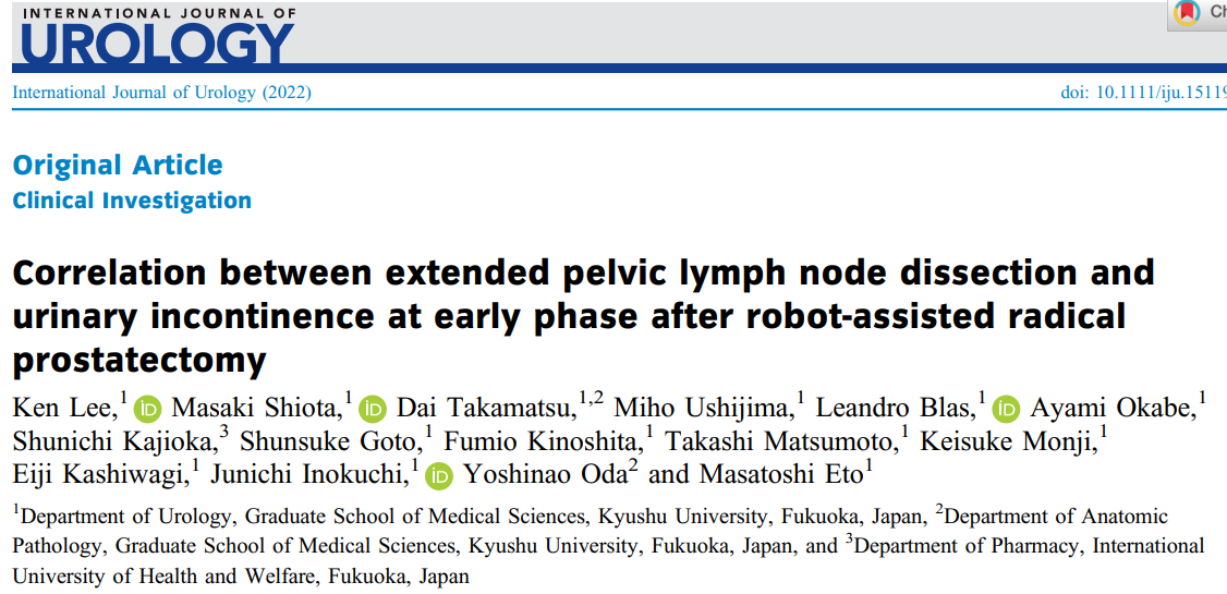 Ken Lee, Masaki Shiota, Dai Takamatsu et al. Correlation between extended pelvic lymph node dissection and urinary incontinence at early phase after robot-assisted radical prostatectomy. Int J Urol. Dec 2022