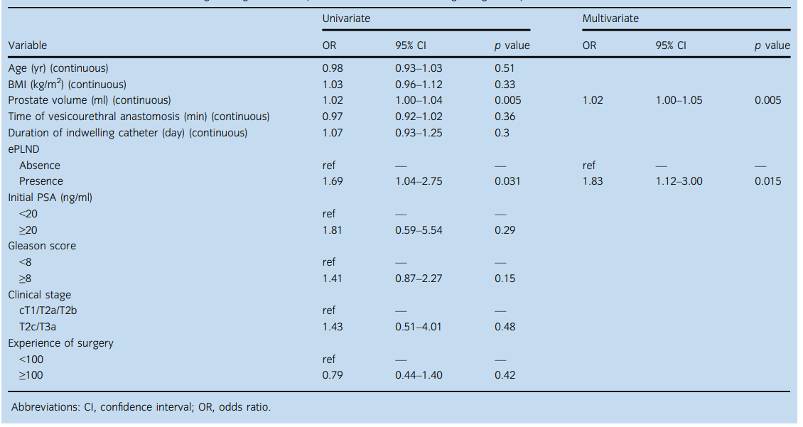 RARP術后1個月時,尿失禁的單變量和多變量邏輯回歸分析