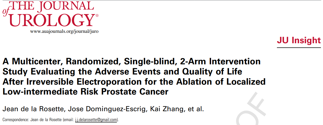 Jean de la Rosette, Jose Dominguez-Escrig, Kai Zhang et al. A Multicenter, Randomized, Single-blind, 2-Arm Intervention Study Evaluating the Adverse Events and Quality of Life After Irreversible Electroporation for the Ablation of Localized Low-intermediate Risk Prostate Cancer. J Urol. Nov 2022