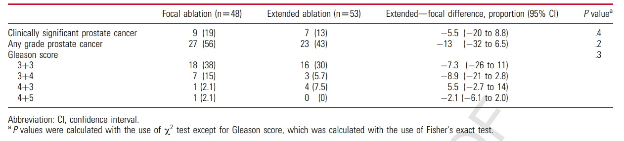 共有51名和55名患者分別接受了局灶和擴展不可逆電穿孔消融術。隨訪時間的中位數為30個月。3個月時,兩組的勃起功能障礙率和不良事件發生率相似。局灶消融組在3個月時的國際勃起功能指數得分更好;在不同時間內,其擴展前列腺癌指數-性功能得分也比擴展消融組好,接近統計學顯著意義(平均差異1.4;95%CI -0.13至2.9,P=0.073)。兩組之間在其他生活質量指標上沒有明顯差異。6個月后進行前列腺活檢時,局灶組和擴展組的臨床意義上的前列腺癌殘留率(Gleason≥3+4)分別為18.8%和13.2%,沒有明顯差異。