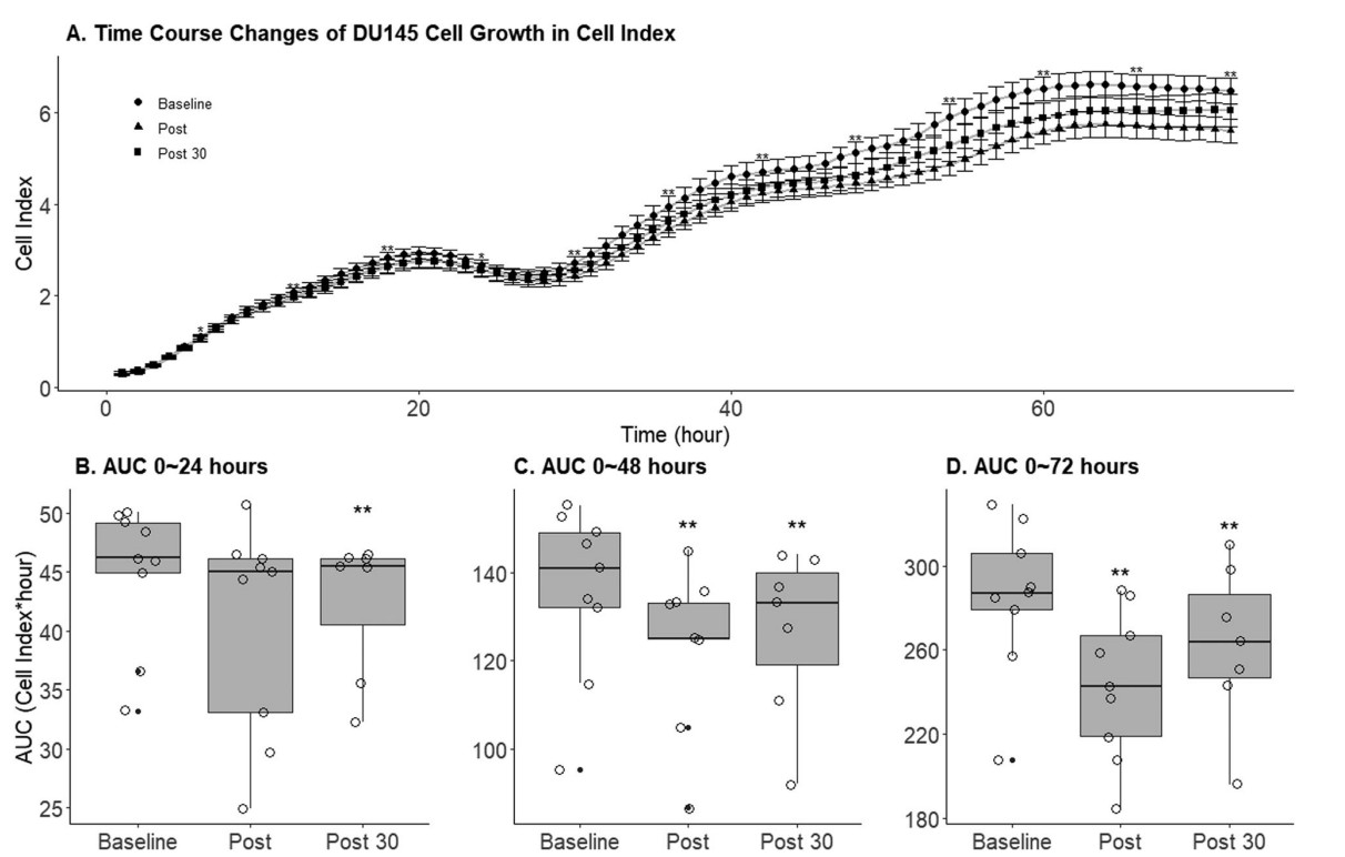結果發現,與基線相比,運動后立即收集的血清中SPARC(19.9%,P=0.048)、OSM(11.5%,P=0.001)、IL-6(10.2%,P=0.02)和IL-15(7.8%,P=0.023)明顯升高;休息30分鐘后恢復到基線水平。與運動前血清相比,運動后立即獲得的血清和運動后30分鐘獲得的血清可引起DU-145細胞生長和細胞指數面積減少(對于運動后立即獲得血清,72小時的細胞指數:16.9%,P<0.001;曲線下面積:15.2%,P<0.001;對于運動后30分鐘獲得血清:72小時的細胞指數:6.5%;曲線下面積:8.8%,P<0.001)。