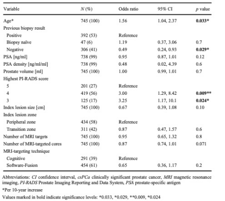 表 聯合活檢與MRI靶向活檢升級為csPCa的關系的單變量分析