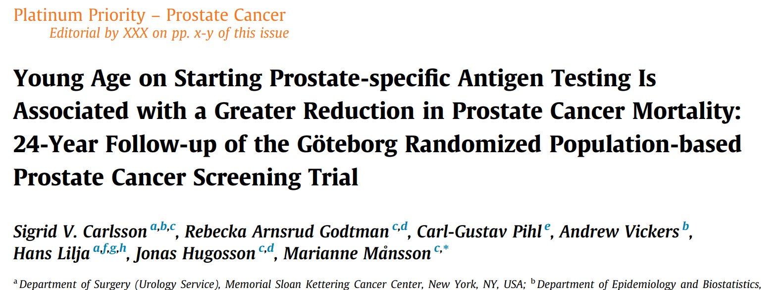 Sigrid V Carlsson, Rebecka Arnsrud Godtman, Carl-Gustav Pihl et al. Young Age on Starting Prostate-specific Antigen Testing Is Associated with a Greater Reduction in Prostate Cancer Mortality: 24-Year Follow-up of the G?teborg Randomized Population-based Prostate Cancer Screening Trial. Eur Urol. Nov 2022