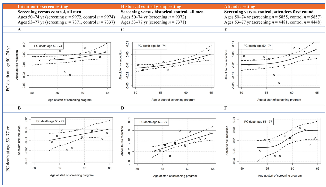 研究招募了50-70歲的男性,并進行兩年一次的PSA篩查(n=10000),對照組不進行上述篩查,但有機會接受PSA檢測(n=10000)。即研究的干預措施是定期或機會性PSA篩查或無PSA篩查。研究人員在三種情況下建立了篩查的起始年齡與PC死亡率絕對風險降低之間的非線性關系模型: