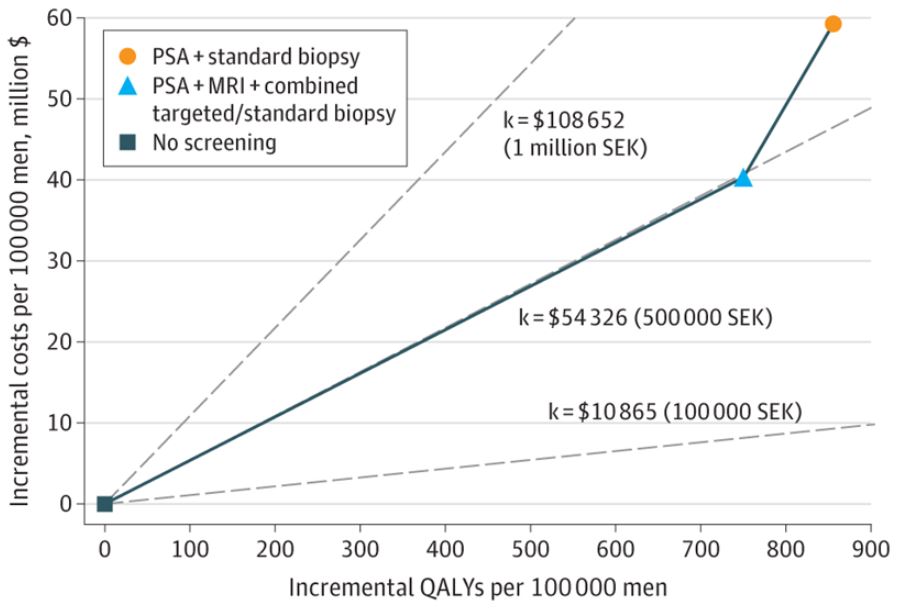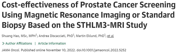 Hao S, Discacciati A, Eklund M, et al. Cost-effectiveness of Prostate Cancer Screening Using Magnetic Resonance Imaging or Standard Biopsy Based on the STHLM3-MRI Study. JAMA Oncol. Published online November 10, 2022. doi:10.1001/jamaoncol.2022.5252