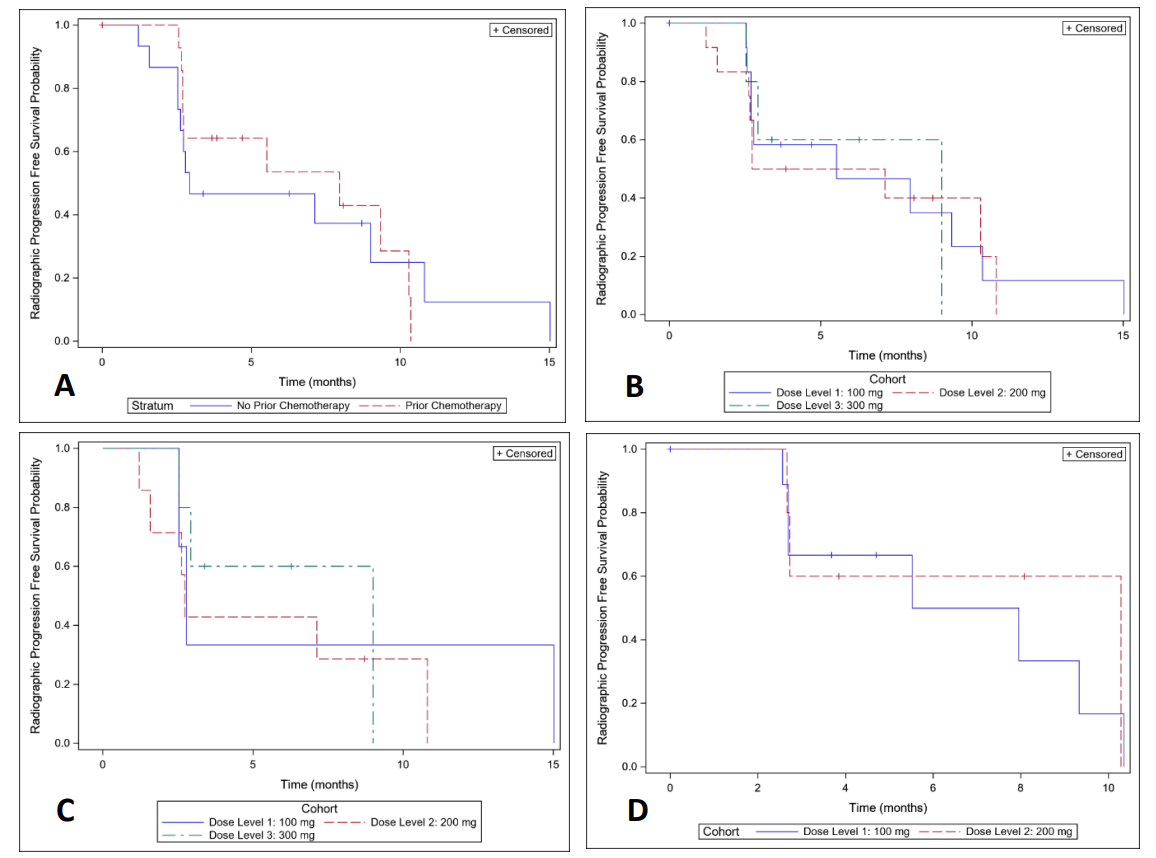 共有30名患者接受了niraparib和鐳-223治療。其中,13名患者接受了100毫克niraparib治療,12名患者接受了200毫克niraparib治療,5名患者接受了300毫克的niraparib治療。共有6起DLT事件:2例(13%)為中性粒細胞減少癥,2例(13%)為血小板減少癥,疲勞和惡心各有1例(3%)。貧血(2/13%)和中性粒細胞減少(2/13%)是最常見的3級不良事件。對于既往接受過化療的患者,MTD為100毫克,而未接受過化療的患者MTD為200毫克。響應者的全血PAX5和CD19基因表達較高,而非響應者的ARG-1、IL-2R和FLT3基因表達較高。