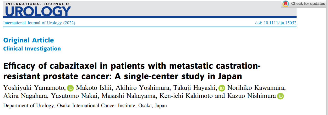 Yoshiyuki Yamamoto , Makoto Ishii , Akihiro Yoshimura et al. Efficacy of cabazitaxel in patients with metastatic castration-resistant prostate cancer: A single-center study in Japan. Int J Urol. Sep 2022