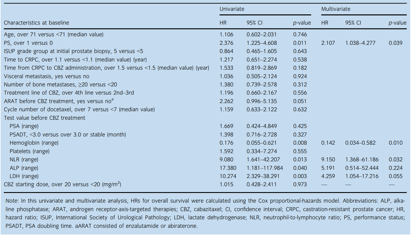 研究最終包括了57名接受卡巴他賽(中位數4個周期,范圍1-27)的患者,起始劑量為15-25mg/m2。中位年齡和隨訪時間為70歲和9.2個月。前列腺特異性抗原無進展生存期和總生存期中位數分別為2.6和10.5個月。單變量分析顯示,卡巴他賽治療前曾接受雄激素受體靶向治療是前列腺特異性抗原無進展生存期的唯一顯著風險因素(危險比2.784,P=0.022)。總生存期的多變量分析顯示,基線時狀態不佳(≥1)(危險比2.107,p=0.039)、低血紅蛋白(危險比0.142,p=0.010)和高中性粒細胞-淋巴細胞比(危險比9.150,p=0.032)與預后不良明顯相關。