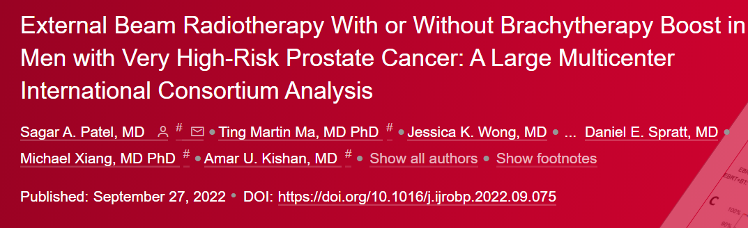 Sagar A Patel , Ting Martin Ma , Jessica K Wong et al. External Beam Radiotherapy With or Without Brachytherapy Boost in Men with Very High-Risk Prostate Cancer: A Large Multicenter International Consortium Analysis. Int J Radiat Oncol Biol Phys. Sep 2022