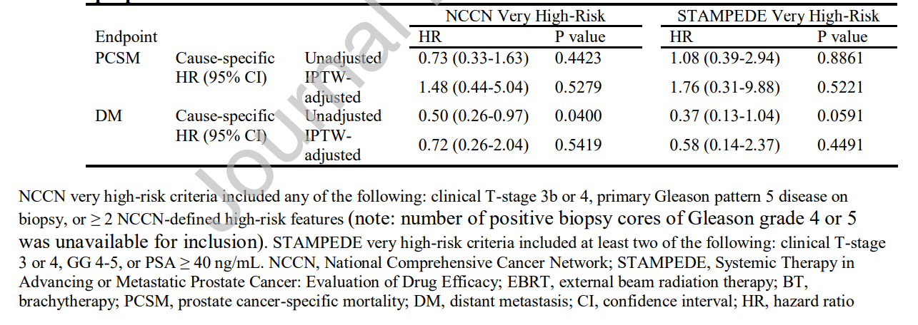 綜上所述,在上述VHR PC隊列中,EBRT聯合≥24個月的ADT與EBRT+BT聯合≥12個月的ADT相比,沒有觀察到臨床意義上的結果差異。