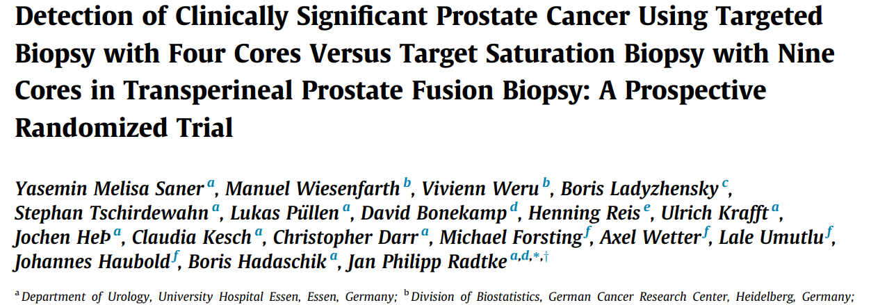 Yasemin Melisa Saner , Manuel Wiesenfarth , Vivienn Weru et al. Detection of Clinically Significant Prostate Cancer Using Targeted Biopsy with Four Cores Versus Target Saturation Biopsy with Nine Cores in Transperineal Prostate Fusion Biopsy: A Prospective Randomized Trial. Eur Urol Oncol. Sep 2022
