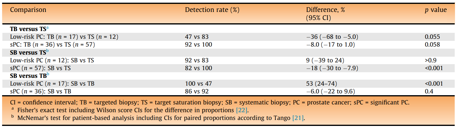 研究人員使用了麥克尼馬爾檢驗對系統性活檢(SB)、TB和TS的PC和csPC(國際泌尿科病理學會等級≥2)檢出率進行了分析,并使用費希爾精確檢驗對TS與TB進行了比較。靶向活檢(TS或TB)與SB的組合作為參考。