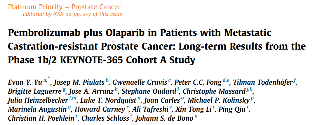 Evan Y Yu, Josep M Piulats, Gwenaelle Gravis et al. Pembrolizumab plus Olaparib in Patients with Metastatic Castration-resistant Prostate Cancer: Long-term Results from the Phase 1b/2 KEYNOTE-365 Cohort A Study. Eur Urol. Aug 2022