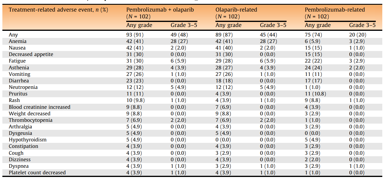 在104名入組患者中,102人接受了治療。治療群體的中位年齡為70歲(四分位數(shù)范圍[IQR],65-76)。根據(jù)RECIST v1.1,59名患者(58%)有可測量的疾病。治療群體從第一次用藥到截止的中位時(shí)間為24月(IQR,22-47)。治療群體的反應(yīng)率為15%。對于有可測量疾病的患者,ORR為8.5%(五個部分反應(yīng))。治療群體的中位rPFS為4.5個月(95%置信區(qū)間[CI],4.0-6.5),中位OS為14個月(95% CI,10.4-18.2)。另外,臨床活性在程序性死亡配體1(PD-L1)陽性和同源重組修復(fù)突變亞組中是一致的。93名患者(91%)發(fā)生了治療相關(guān)的不良事件(TRAEs)。49名患者(48%)發(fā)生了3-5級的TRAEs。6例死亡(5.9%)是由不良事件引起的;2例(心肌梗死和原因不明)是由治療引起的。該研究的局限性包括了單臂設(shè)計(jì)。