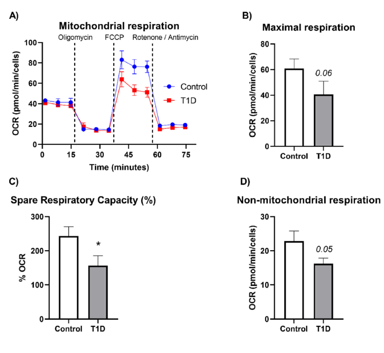 與對照組相比,T1D患者血液中的快速抗氧化劑和總抗氧化劑水平較低,而他們的白細胞產生較高數量的總活性氧物種(ROS)和超氧陰離子自由基。與對照組相比,T1D組和對照組PBMCs的基礎呼吸和與ATP相關的呼吸相似,但T1D組PBMCs的備用呼吸量減少,最大呼吸減少,非線粒體呼吸減少。