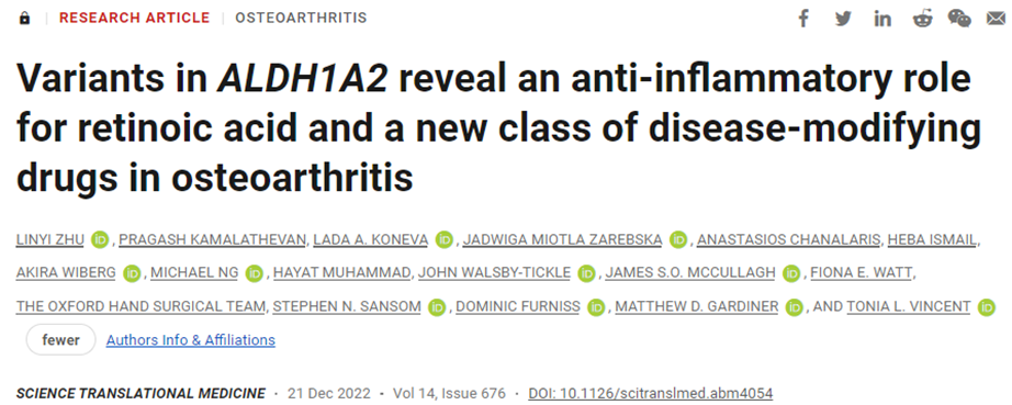 Linyi Zhu et al. Variants in ALDH1A2 reveal an anti-inflammatory role for retinoic acid and a new class of disease-modifying drugs in osteoarthritis. Science Translational Medicine, 2022, doi:10.1126/scitranslmed.abm4054.