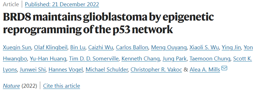 1. Xueqin Sun et al. BRD8 maintains glioblastoma by epigenetic reprogramming of the p53 network. Nature, 2022, doi:10.1038/s41586-022-05551-x.