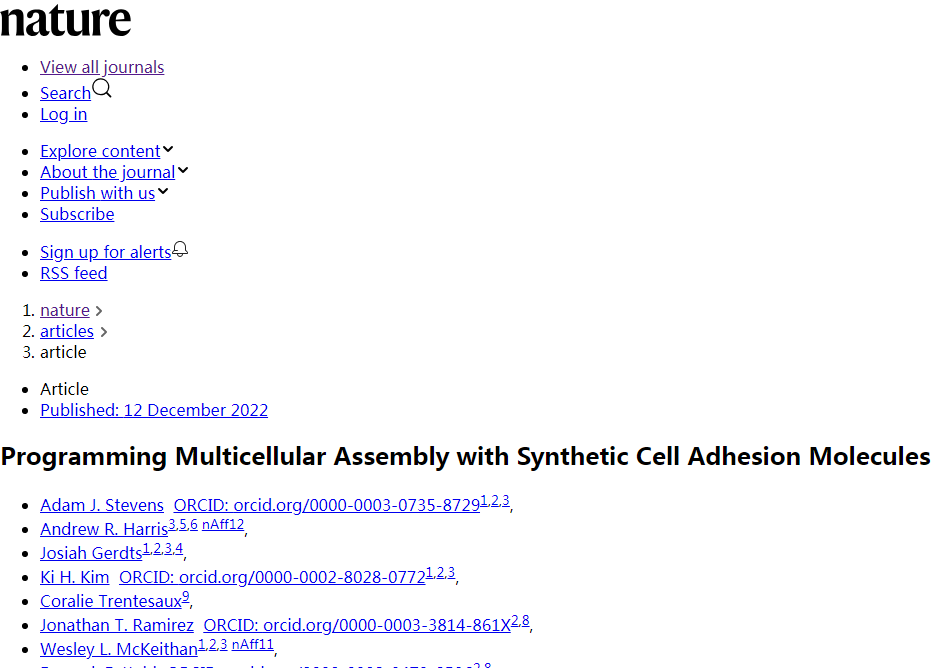 Stevens, A.J., Harris, A.R., Gerdts, J. et al. Programming Multicellular Assembly with Synthetic Cell Adhesion Molecules. Nature (2022). doi:10.1038/s41586-022-05622-z