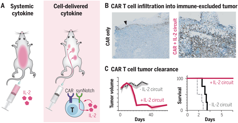 這些作者察到他們設計的synNotch誘導IL-2產生的回路(下稱synNotch→IL-2回路)促使嵌合抗原受體(CAR)或TCR T細胞有效地浸潤到胰腺癌和黑色素瘤的免疫抑制性腫瘤模型中。在這些具有挑戰性的免疫功能的腫瘤模型中,這種浸潤的改善與腫瘤清除率和生存率的大幅提高有關。與全身遞送IL-2不同,這種局部的IL-2回路不顯示毒性,因為它不依賴于TCR/CAR的激活,但仍靶向腫瘤。