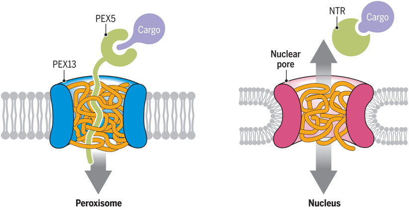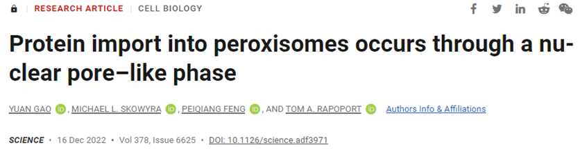 Yuan Gao et al. Protein import into peroxisomes occurs through a nuclear pore–like phase. Science, 2022, doi:10.1126/science.adf3971.