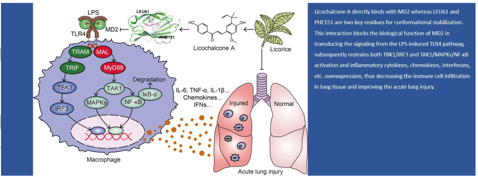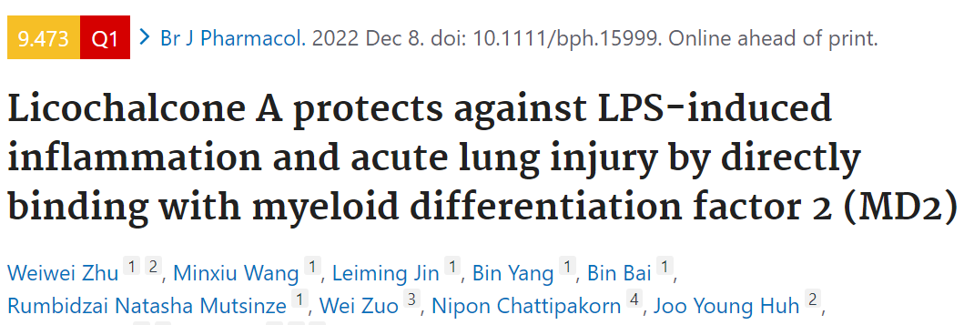 Weiwei Zhu et al. Licochalcone A protects against LPS-induced inflammation and acute lung injury by directly binding with myeloid differentiation factor 2 (MD2). Br J Pharmacol. 2022 Dec 8. doi: 10.1111/bph.15999.