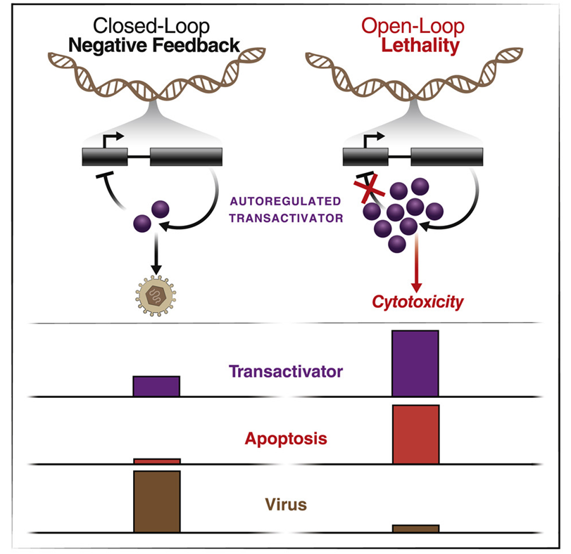 一些對(duì)病毒生長(zhǎng)至關(guān)重要的病毒蛋白在高濃度下會(huì)對(duì)宿主細(xì)胞產(chǎn)生毒性。因此,這些蛋白在水平過(guò)高時(shí)關(guān)閉它們自己的表達(dá),以防止它們所依賴的宿主細(xì)胞死亡---這種系統(tǒng)被稱為負(fù)反饋回路(negative feedback loop)。正如這項(xiàng)新的研究所報(bào)道的那樣,反饋干擾劑靶向并破壞了這些遺傳反饋回路,使受感染的宿主細(xì)胞自我毀滅,并阻止感染的發(fā)生。