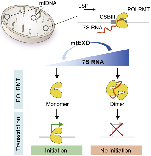 這些作者發(fā)現(xiàn)7S RNA具有調(diào)節(jié)功能,因?yàn)樗隗w外和培養(yǎng)的人類細(xì)胞中控制線粒體的轉(zhuǎn)錄水平。通過(guò)使用低溫電鏡(cryo-EM)技術(shù),他們發(fā)現(xiàn)線粒體RNA聚合酶POLRMT通過(guò)與7S RNA相互作用發(fā)生二聚化。由此產(chǎn)生的POLRMT二聚體界面封存了啟動(dòng)子識(shí)別和線粒體DNA解鏈所需的結(jié)構(gòu)域,從而阻止了線粒體DNA轉(zhuǎn)錄啟動(dòng)。他們提出,非編碼7S RNA分子是調(diào)節(jié)哺乳動(dòng)物細(xì)胞線粒體轉(zhuǎn)錄的負(fù)反饋回路的一個(gè)組成部分。