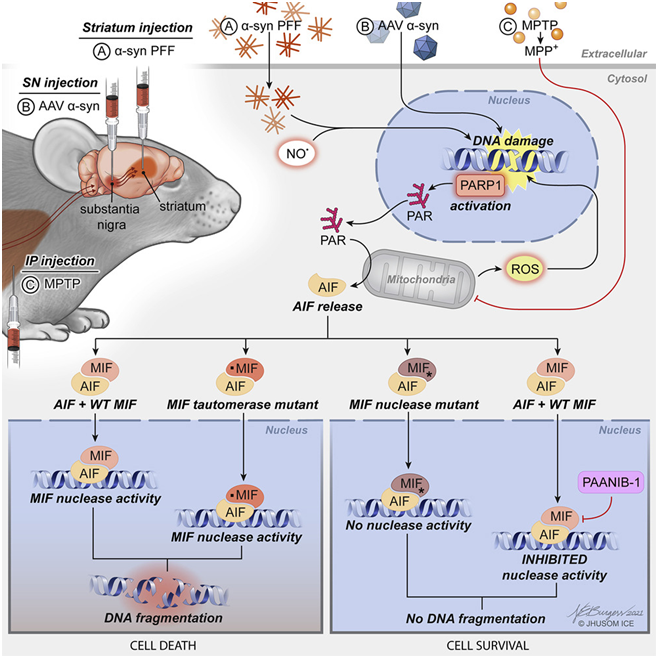 Dawson領(lǐng)導(dǎo)的先前研究已表明一種稱為parthanatos相關(guān)凋亡誘導(dǎo)因子核酸酶(parthanatos associated apoptosis-inducing factor nuclease, PAAN)的蛋白對(duì)受α-突觸核蛋白聚集物影響的腦細(xì)胞進(jìn)行最后打擊,破壞細(xì)胞的DNA。除了帕金森病之外,PAAN蛋白還與中風(fēng)中的細(xì)胞死亡有關(guān)。然而,PAAN在大腦中有多種功能,包括在免疫系統(tǒng)中的活性,這些活性需要維持以保持大腦的健康。