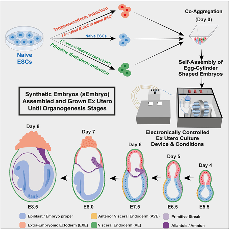 在一項(xiàng)新的研究中,來(lái)自以色列魏茨曼科學(xué)研究所和布魯斯-拉帕波特醫(yī)學(xué)院的研究人員首次在不使用精子、卵子或受精的情況下構(gòu)建出“合成胚胎(synthetic embryo)”,但使用這種技術(shù)培育用于移植的人體器官的前景仍然很遙遠(yuǎn)。具體而言,他們找到了一種方法,讓小鼠干細(xì)胞在實(shí)驗(yàn)室中自我組裝成胚胎狀結(jié)構(gòu)。這一突破被譽(yù)為向前邁進(jìn)了一大步,盡管一些專家說(shuō),所構(gòu)建出的合成胚胎可能不能完全被視為胚胎,并警告說(shuō)要考慮未來(lái)的倫理問(wèn)題。相關(guān)研究結(jié)果于2022年8月1日在線發(fā)表在Cell期刊上,論文標(biāo)題為“Post-Gastrulation Synthetic Embryos Generated Ex Utero from Mouse Naïve ESCs”。