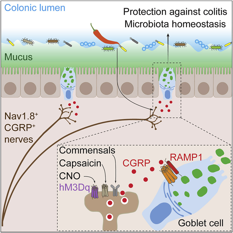 在一項(xiàng)新的研究中,來(lái)自美國(guó)哈佛醫(yī)學(xué)院、芝加哥大學(xué)和瑞典哥德堡大學(xué)的研究人員指出在小鼠中,情況可能就是這樣。他們發(fā)現(xiàn)小鼠腸道中的疼痛神經(jīng)元---傷害感受神經(jīng)元(nociceptor neuron)---在正常情況下調(diào)節(jié)保護(hù)性粘液的存在,并在炎癥狀態(tài)下刺激腸道細(xì)胞釋放更多粘液。相關(guān)研究結(jié)果于2022年10月14日在線發(fā)表在Cell期刊上,論文標(biāo)題為“Nociceptor neurons direct goblet cells via a CGRP-RAMP1 axis to drive mucus production and gut barrier protection”。