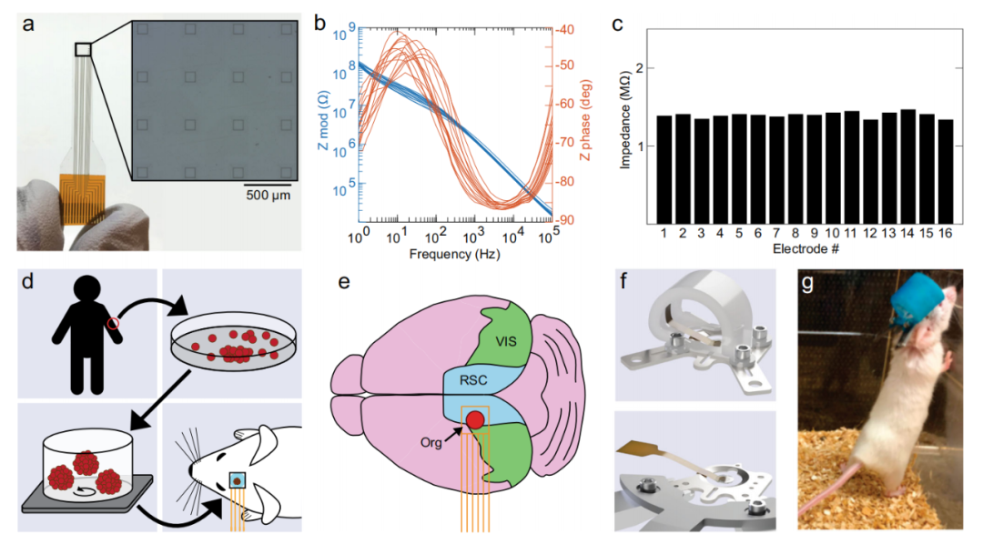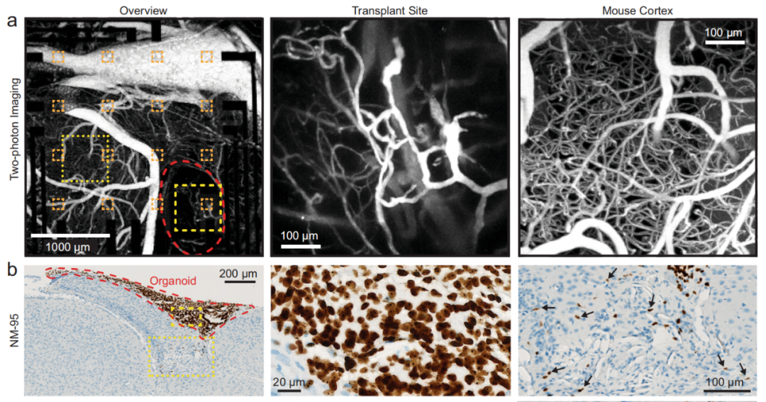 通過在移植的類器官上放置一個這樣的電極陣列,研究團隊能夠記錄來自植入的類器官和周圍宿主皮層的實時神經活動。通過雙光子成像,他們還觀察到小鼠血管生長到類器官植入物中,為其提供必要的營養和氧氣。