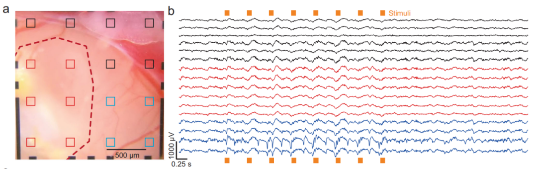 不僅如此,研究團隊還將一種用于視覺刺激的白光LED應用到植入類器官的小鼠身上,同時對小鼠進行雙光子顯微鏡檢查。他們觀察到類器官上電極通道的電活動,表明類器官對刺激的反應與周圍的宿主皮質組織相同。電生理活動通過功能連接從植入的類器官區最接近視覺皮層的區域傳播。