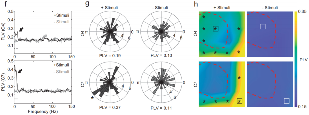 此外,這種透明石墨烯電極技術能夠記錄類器官和周圍小鼠皮層的電尖峰信號,石墨烯記錄顯示伽馬振蕩的功率增加,以及從類器官到小鼠視覺皮層的緩慢振蕩的尖峰相位鎖定。這些發現表明,類器官在植入三周后就與周圍的皮層組織建立了突觸連接,并接受了來自小鼠大腦的功能輸入。