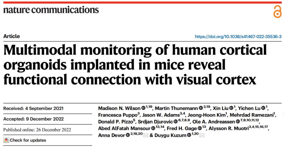 近日,美國加州大學圣地亞哥分校的研究人員在 Nature Communications 期刊發表了題為:Multimodal monitoring of human cortical organoids implanted in mice reveal functional connection with visual cortex 的研究論文。
