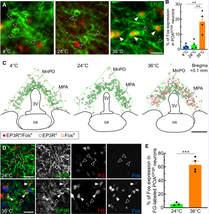 然而,目前研究人員并不清楚視前區中的那種神經元能釋放增加或降低機體體溫的指令,為了識別出到底是哪種神經元,研究者Kazuhiro Nakamura等人對大鼠進行研究,重點分析了其視前區中EP3神經元,該神經元能表達PGE2的EP3受體,同時研究人員還調查了其調節機體體溫的功能。這項研究中,研究人員首次分析了視前區中EP3神經元的活性是如何隨著環境溫度的改變而發生變化;大鼠所處的舒適環境溫度約為28度,在兩個小時內,研究人員將大鼠暴露于寒冷(4度)、室溫(24度)和高溫(36度)環境中,研究結果表明,暴露于36度下或能激活EP3神經元,而暴露于4度和24度下則并不會。