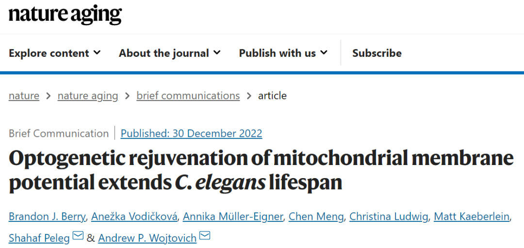 近日,羅切斯特大學醫學中心、德國農場動物生物學研究所、華盛頓大學、慕尼黑工業大學的研究人員合作,在 Nature 子刊 Nature Aging 上發表了題為:Optogenetic rejuvenation of mitochondrial membrane potential extends C. elegans lifespan 的研究論文。