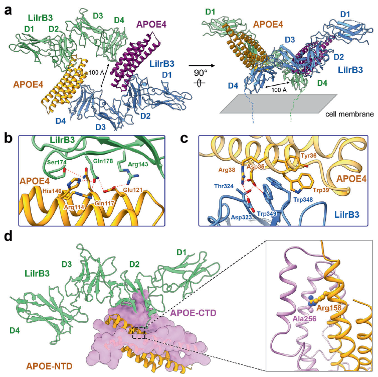該研究證明,APOE4特異性地與LilrB3(白細胞免疫球蛋白樣受體B3)相互作用。LilrB3胞外結構域(ECD)的兩個不連續免疫球蛋白樣結構域識別APOE4的N端結構域(NTD)上帶正電荷的表面模塊。