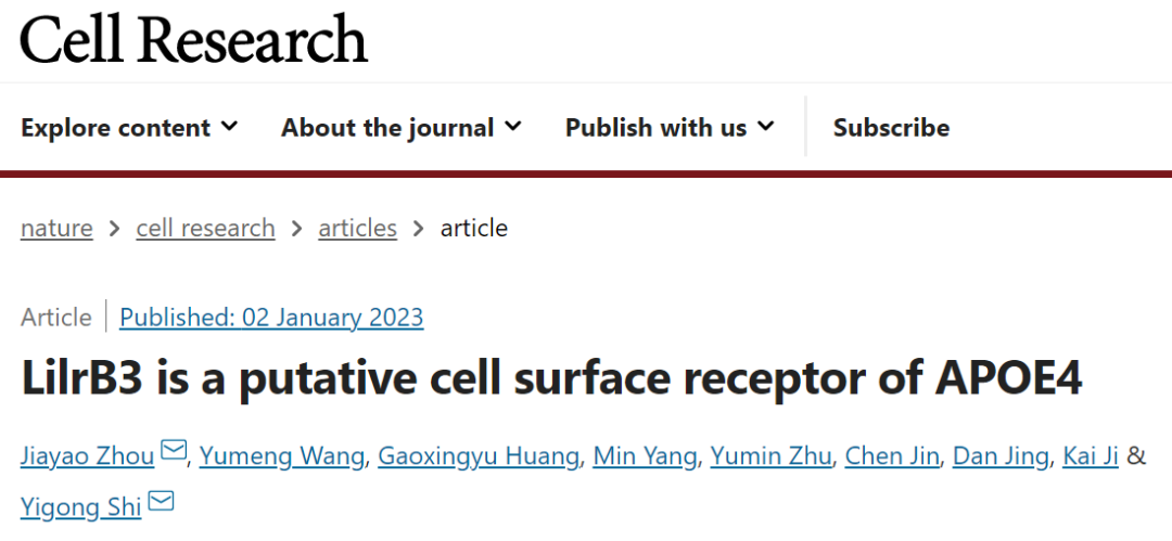 2022年1月2日,西湖大學施一公團隊在 Cell Research 期刊發表了題為:LilrB3 is a putative cell surface receptor of APOE4 的研究論文。