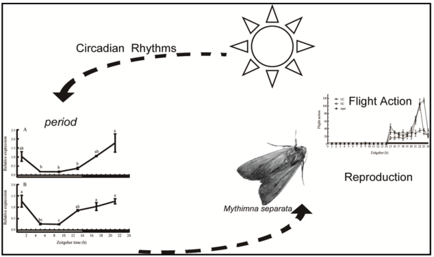 東方粘蟲 Mythimna separata (Walker)是我國玉米、小麥和水稻三大主糧作物上重大遷飛性害蟲,自古以來有“神蟲”之稱,2020年被列入國家一類農作物病蟲害名錄,對國家糧食安全和生物安全造成重大威脅。每年在我國廣大地區呈現季節性南北往返遷飛危害,遠距離遷飛和高產卵量是其暴發成災的重要因素。粘蟲成蟲遷飛和產卵行為主要發生在夜間,具有明顯的季節性和晝夜節律,但關于粘蟲飛行和生殖行為節律的分子調控機制仍未清晰。