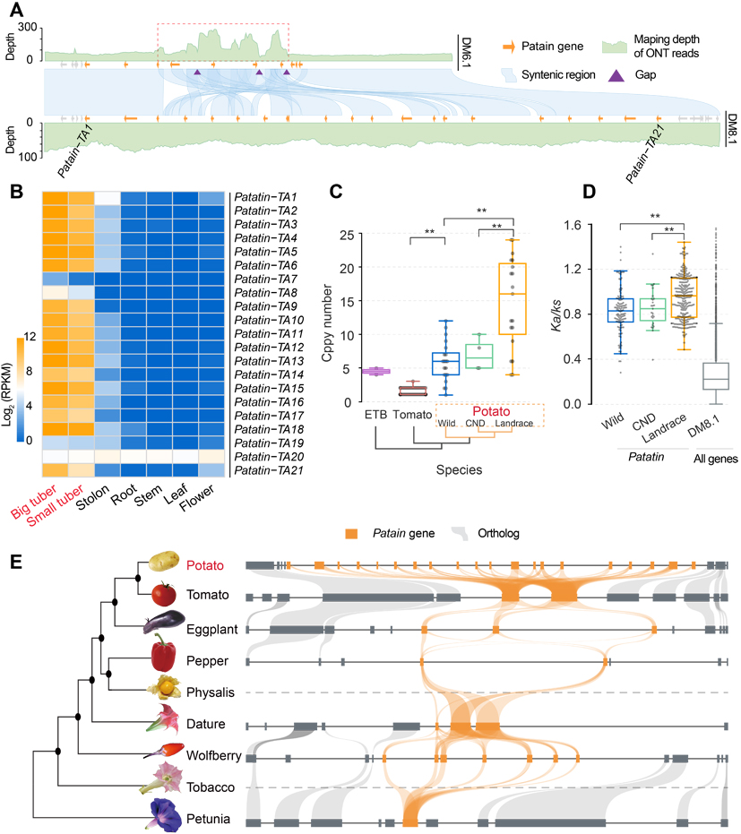 研究進(jìn)一步發(fā)現(xiàn)在基因組DM6.1未填補(bǔ)的gap中存在高度串聯(lián)重復(fù)的基因簇,且這些基因調(diào)控馬鈴薯的重要農(nóng)藝性狀,包括patatin、TPS、Cupin、Leucine-rich repeat等基因(圖3A)。其中塊莖儲(chǔ)藏蛋白patatin基因在馬鈴薯基因組中特異性大量擴(kuò)增,且這一擴(kuò)增過程在馬鈴薯物種形成、馴化和育種改良過程中持續(xù)發(fā)生;除拷貝數(shù)大量擴(kuò)增之外,patatin的基因功能同時(shí)受到了強(qiáng)烈的正向選擇;轉(zhuǎn)錄組分析顯示,這些高度擴(kuò)增的patatin基因絕大部分在馬鈴薯塊莖中特異性高表達(dá)(圖3B-E)。基于以上發(fā)現(xiàn),推測(cè)patatin基因通過劑量擴(kuò)增和功能進(jìn)化在馬鈴薯作物馴化和塊莖形成中發(fā)揮了關(guān)鍵作用。該發(fā)現(xiàn)同時(shí)也提示了通過調(diào)控單個(gè)或少量關(guān)鍵基因的拷貝數(shù)/絕對(duì)劑量來進(jìn)行作物改良的潛在可行性。