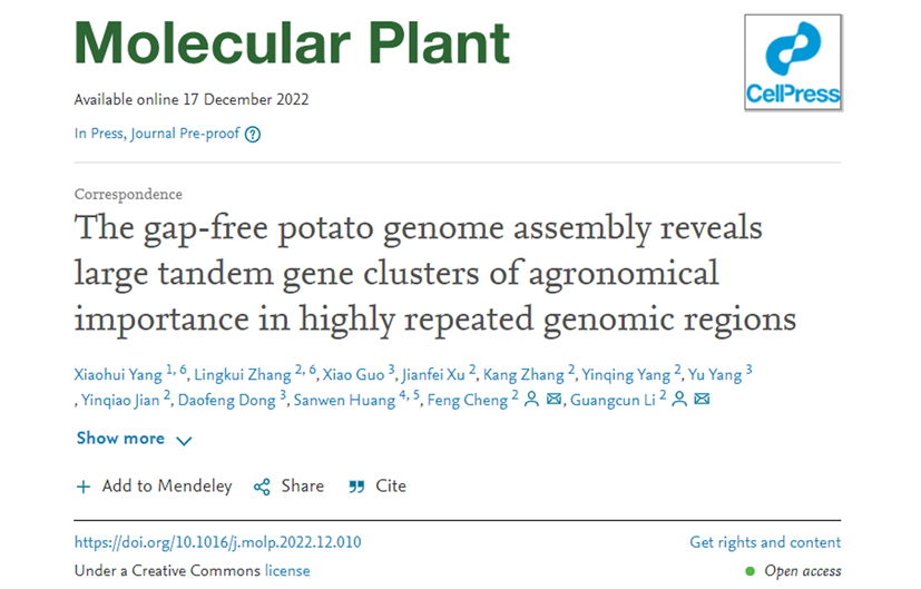 中國(guó)農(nóng)業(yè)科學(xué)院蔬菜花卉研究所馬鈴薯遺傳育種與栽培創(chuàng)新團(tuán)隊(duì)和蔬菜分子設(shè)計(jì)育種創(chuàng)新團(tuán)隊(duì),對(duì)馬鈴薯單倍型DM的基因組進(jìn)行了全序列組裝,獲得了包含24個(gè)端粒和12個(gè)著絲粒完整序列的馬鈴薯單倍型DM的端粒到端粒(T2T)的基因組完成圖(DM8.1),并在之前馬鈴薯基因組未能完整組裝的高度重復(fù)序列區(qū)域中,發(fā)現(xiàn)了調(diào)控重要農(nóng)藝性狀的大量串聯(lián)復(fù)制的基因簇。相關(guān)研究成果于近日以The gap-free potato genome assembly reveals large tandem gene clusters of agronomical importance in highly repeated genomic regions為題發(fā)表在Molecular Plant(IF=21.949)上。