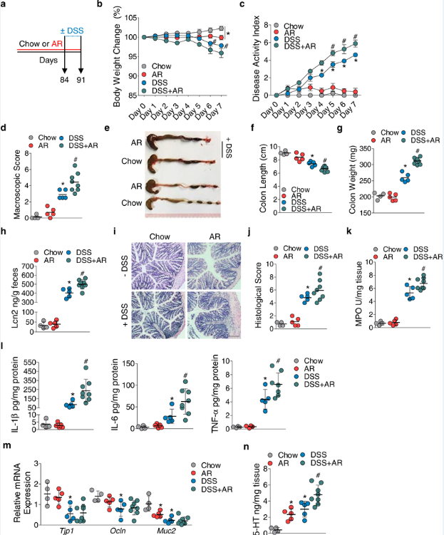 食品中的化學物質被廣泛使用,從而導致了人類大量的暴露,誘惑紅(AR,Allura Red AC)就是一種非常常見的合成著色劑(synthetic colorant),然而,研究人員并不清楚其對結腸炎的影響效應。近日,一篇發表在國際雜志Nature Communications上題為“Chronic exposure to synthetic food colorant Allura Red AC promotes susceptibility to experimental colitis via intestinal serotonin in mice”的研究報告中,來自麥克馬斯特大學等機構的科學家們通過研究發現,長期攝入誘惑紅食物染料或會潛在誘發機體炎性腸病的發生,文章中,研究人員利用炎性腸病實驗性動物模型進行研究后發現,持續暴露于誘惑紅或會損傷機體腸道健康并促進機體炎癥發生。