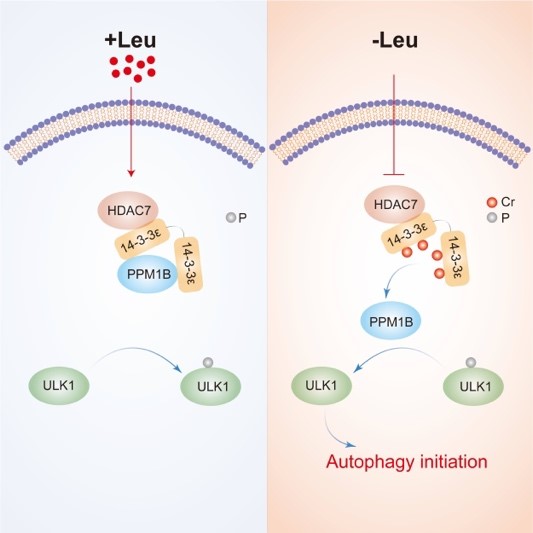 近日,農業(yè)微生物學全國重點實驗室、湖北洪山實驗室、華中農業(yè)大學動物育種與健康養(yǎng)殖前沿科學中心晏向華教授團隊研究成果以“Lysine crotonylation regulates leucine-deprivation-induced autophagy by a 14-3-3ε-PPM1B axis”為題在Cell Reports發(fā)表,研究揭示了亮氨酸通過賴氨酸巴豆酰化修飾途徑調節(jié)自噬起始過程的分子機制。