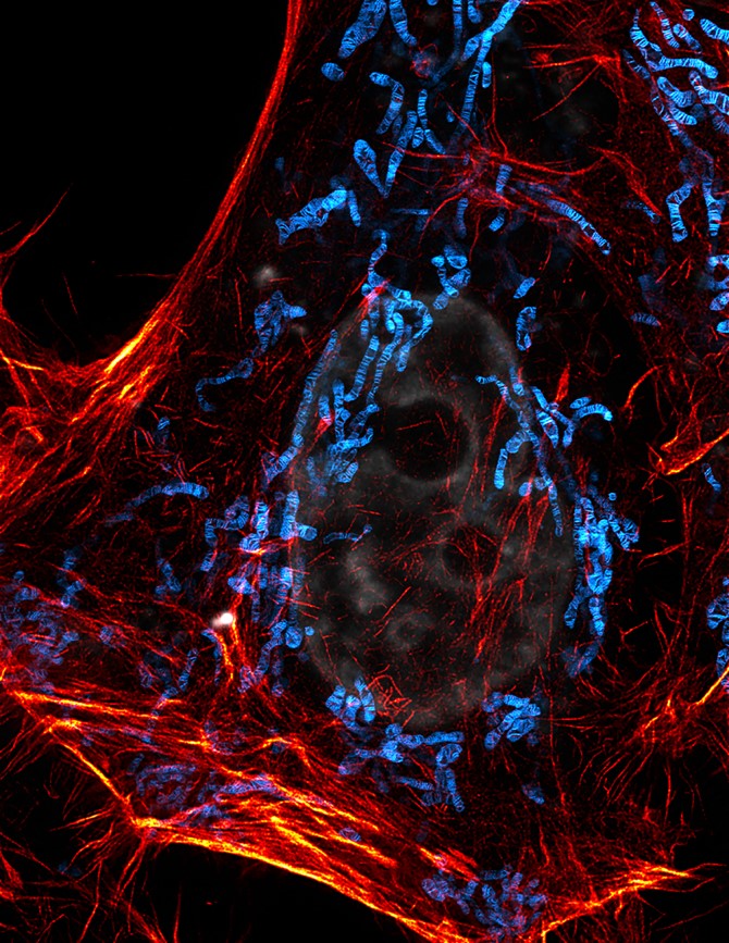 圖1:PKMO標記的HeLa細胞線粒體內嵴、微絲蛋白(SPY650FastAct)和細胞核(SPY505 DNA)的多色活細胞成像圖