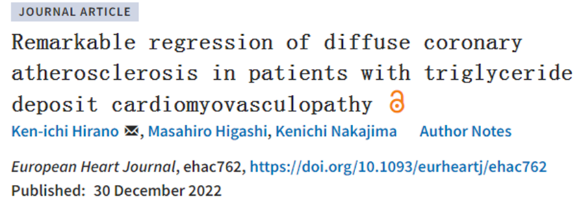 Ken-ichi Hirano et al. Remarkable regression of diffuse coronary atherosclerosis in patients with triglyceride deposit cardiomyovasculopathy. European Heart Journal, 2022, doi:10.1093/eurheartj/ehac762.