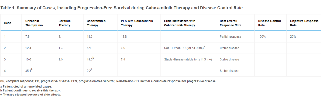 卡博替尼是?種可?服的多靶點 TKI(對 AXL、KIT、MET、RET、ROS1、 VEGFR2、TIE2 有活性),?前可?于腎細胞癌和甲狀腺髓樣癌。卡博替尼在對克唑替尼和塞瑞替尼產?耐藥性的 ROS1 陽性 NSCLC 患者中顯?出療效。報告了四名既往接受過治療的患者(其中三名接受過克唑 替尼和?瑞替尼)的病例系列【6】的結果;在該系列中,卡博替尼在?名患者中實現了 100% DCR 和 OR,?中位 PFS 范圍為 4.9 ? 13.8 個? 。