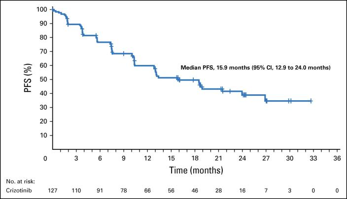 客觀緩解率為62%(95% CI, 45%~ 77%),其中1例完全緩解,19例部分緩解;緩解持續時間為21.0個月(95% CI, 17~ 25個月);疾病控制率為81%(95% CI, 65%~ 91%)。所有患者中位無進展生存期為9.3個月(95% CI, 0~ 22個月),未接受過克唑替尼治療患者的中位無進展生存期為19.3個月(95% CI, 1~ 37個月)。中位總生存期為24個月(95% CI, 5~ 43個月)。
