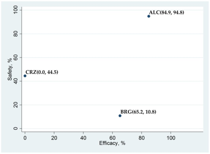 ALK抑制劑在無進展生存期(療效)和 G3–5AAE(安全性)方面對總體患者人群的療效和安全性的累積排序 (SUCRA) 值下的表面散點圖。ALC,阿來替尼;CRZ,克唑替尼;BRG,布格替尼